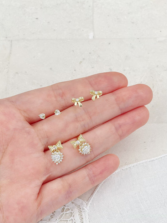 Gold Plated Diamond Mini Bow Set Stud Earrings 3-Pack
