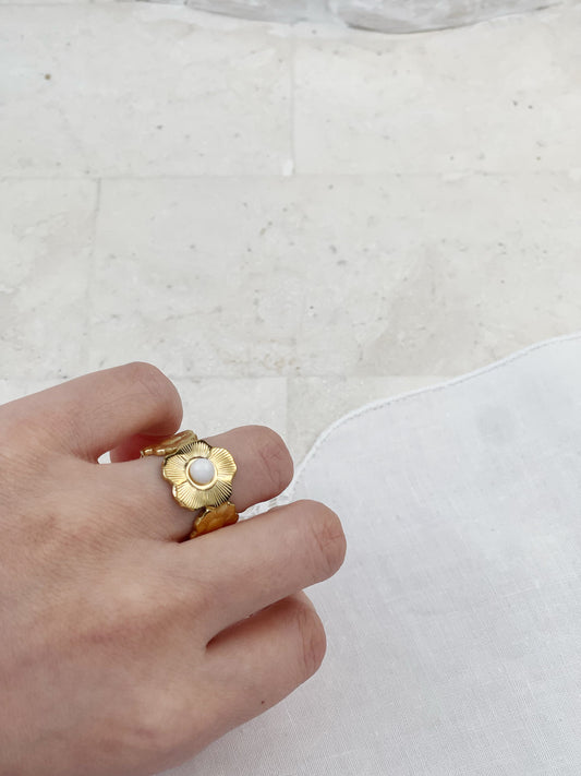 Gold White Chalcedony Flower Ring